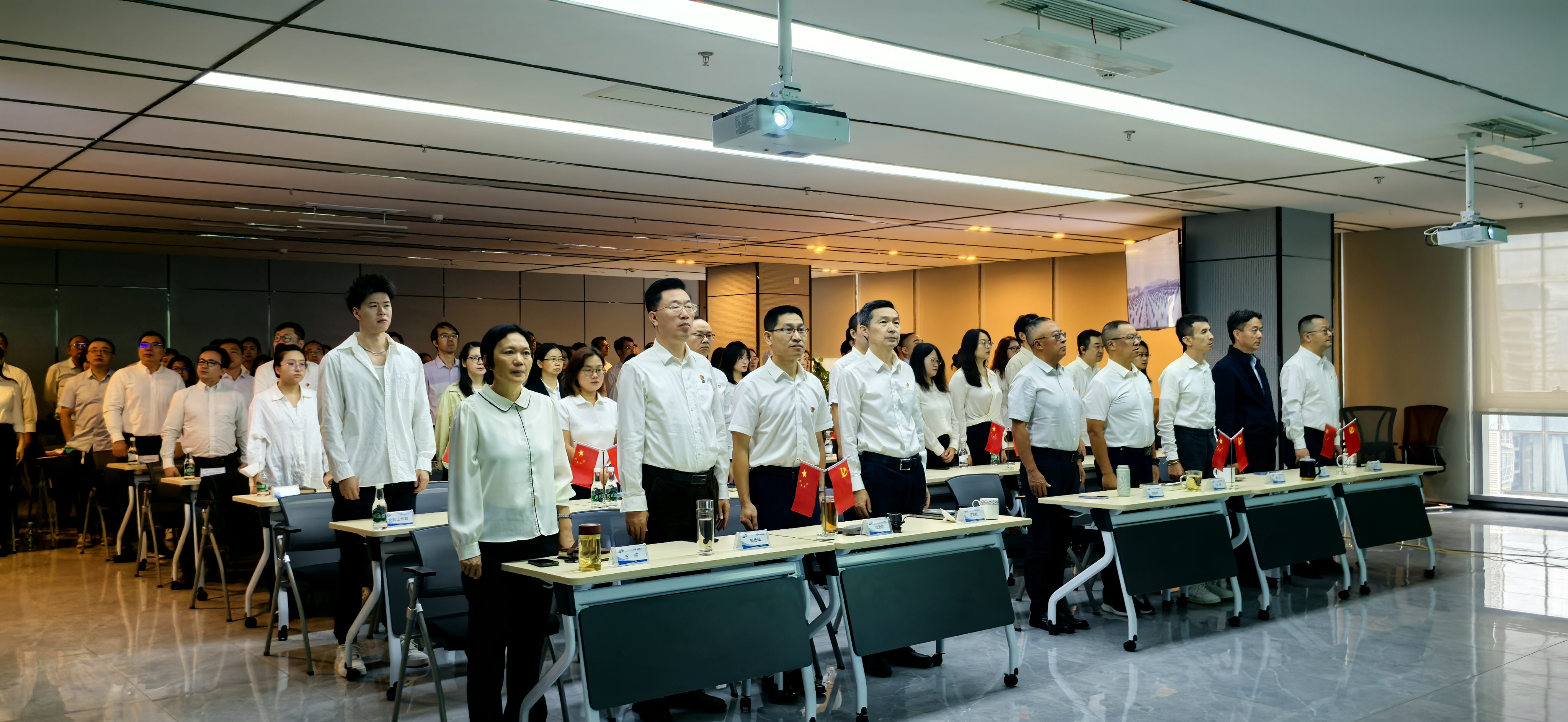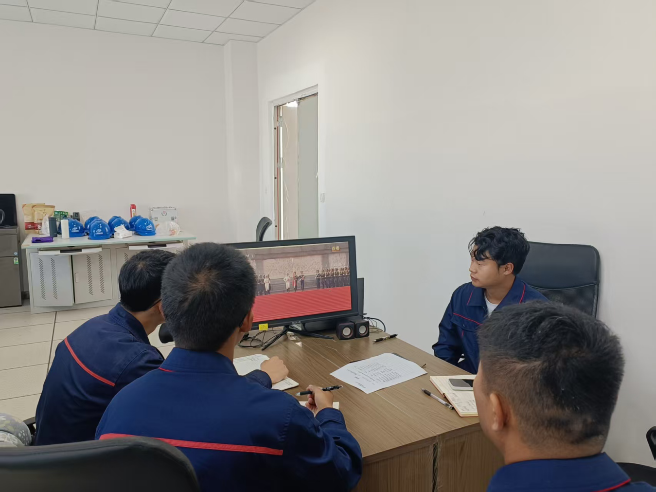 窗明几净的会议室内干部职工身着统一工装,整齐端坐,神情庄重而专注